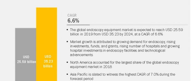 According to the recent report “Endoscopy Equipment Market by Product (Endoscope (Flexible, Rigid, Capsule) Visualization Systems, Endoscopic Ultrasound, Insufflator)), Application (GI Endoscopy, Laparoscopy, Cystoscopy, Bronchoscopy, Colonoscopy, Arthroscopy) – Global Forecast to 2024″, is projected to reach USD 35.2 billion by 2024 from an estimated USD 25.6 billion in 2019 at a CAGR of 6.6%