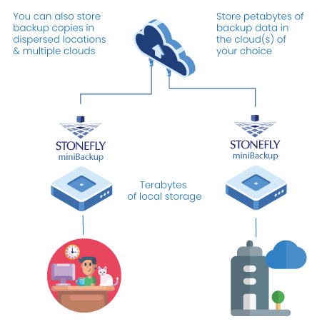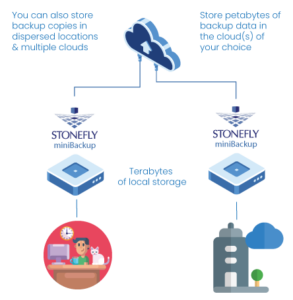 StoneFly’s introduced miniBackup™ appliances leverage mainstream software like Veeam, Commvault, Veritas, Rubrik, etc. to deliver enterprise backup & DR for remote environments, SMBs, home offices, and employees working from home – with terabytes of fault-tolerant on-premises storage, integrated Azure, AWS, or StoneFly cloud storage, and enterprise data services.