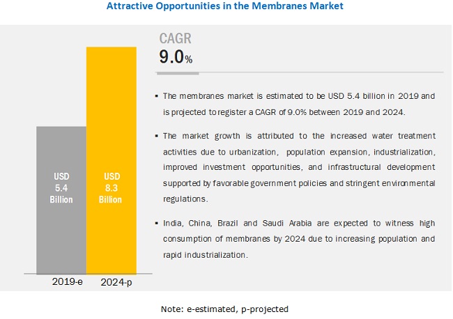 CITY, Country, 2021-Oct-28 — /EPR Network/ — The membranes market size is projected to grow from USD 5.4 billion in 2019 to USD 8.3 billion by 2024, at a CAGR of 9.0%. The major drivers for the membranes market include increasing population, rising awareness about wastewater reuse, and rapid industrialization. Also, shift from chemical treatment of water to physical treatment of water, strict regulations regarding water treatment, and water discharge, and changing climate dynamics in terms of amount of precipitation are also driving the membranes market.