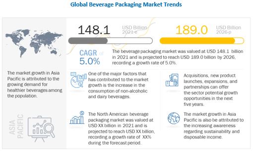 The global beverage packaging market is valued at USD 148.1 billion in 2021 and is projected to reach nearly USD 189.0 billion by 2026, growing at a CAGR of 5.0%. The key drivers of the market are the rise in consumption of alcoholic beverages in emerging economies of Asia Pacific; dairy beverages worldwide. The population and income are growing in tandem with the increasing health and hygiene concerns. The urban population is increasing with the rising employability in urban areas, which, in turn, is leading to the changing lifestyle and adoption of on-the-go consumption.