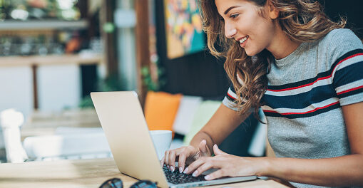 Attractive young woman sitting in cafe and typing on a laptop, with copy space.