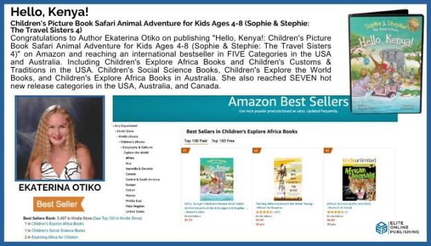 Elite Online Publishing marketed, promoted, and achieved #1 International Bestseller in FIVE Categories in the USA and Australia. Including Children’s Explore Africa Books and Children’s Customs & Traditions in the USA. Children’s Social Science Books, Children’s Explore the World Books, and Children’s Explore Africa Books in Australia. She also reached SEVEN hot new release categories in the USA, Australia, and Canada.