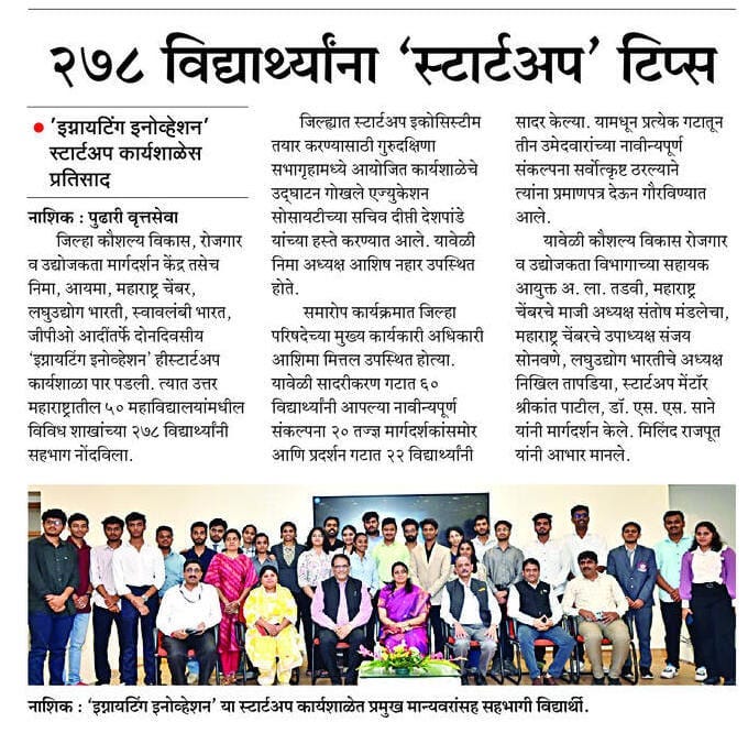 Over 150 students from 50 colleges across North Maharashtra participated in the Igniting Innovation event, presenting their startup ideas, meeting investors, and gaining insights from industry experts. The event featured a full-day startup exhibition, pitching competitions, and an investor meet, followed by expert sessions on the second day.