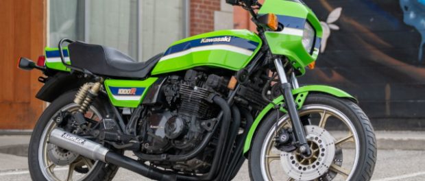 A 1983 Kawasaki KZ 1000R motorcycle, also known as the Eddie Lawson Replica (named after the bike racing icon who rode factory-tuned Kawasaki KZ1000s to Superbike Championships in 1981 and 1982), is visually striking in Kawasaki Racing Green with yellow accents. Features include a 998cc air-cooled inline-four engine with double overhead cams producing 79 hp and 59 lb-ft of torque, a bikini fairing, stepped seat, and rearset footpegs. Estimate: $20,000-$24,000.