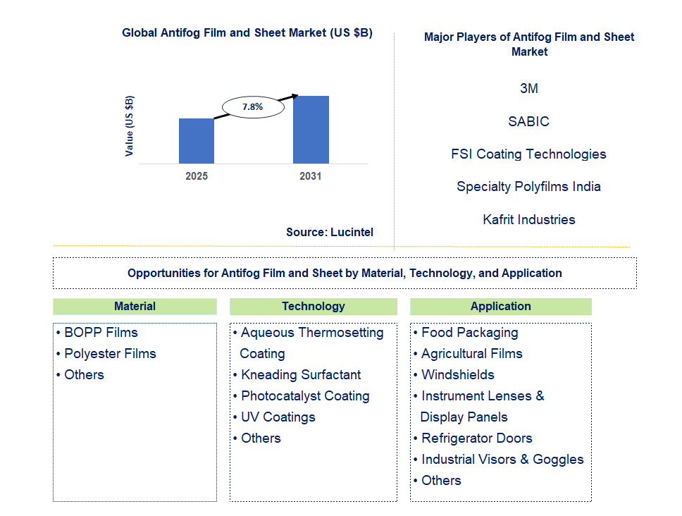 A more than 150-page report to understand trends, opportunity and forecast in antifog film and sheet market to 2031 by material (BOPP films, polyester films, and others), technology (aqueous thermosetting coating, kneading surfactant, photocatalyst coating, UV coatings, and others), application (food packaging, agricultural films, windshields, instrument lenses & display panels, refrigerator doors, industrial visors & goggles, and others), and region (North America, Europe, Asia Pacific, and the Rest of the World).