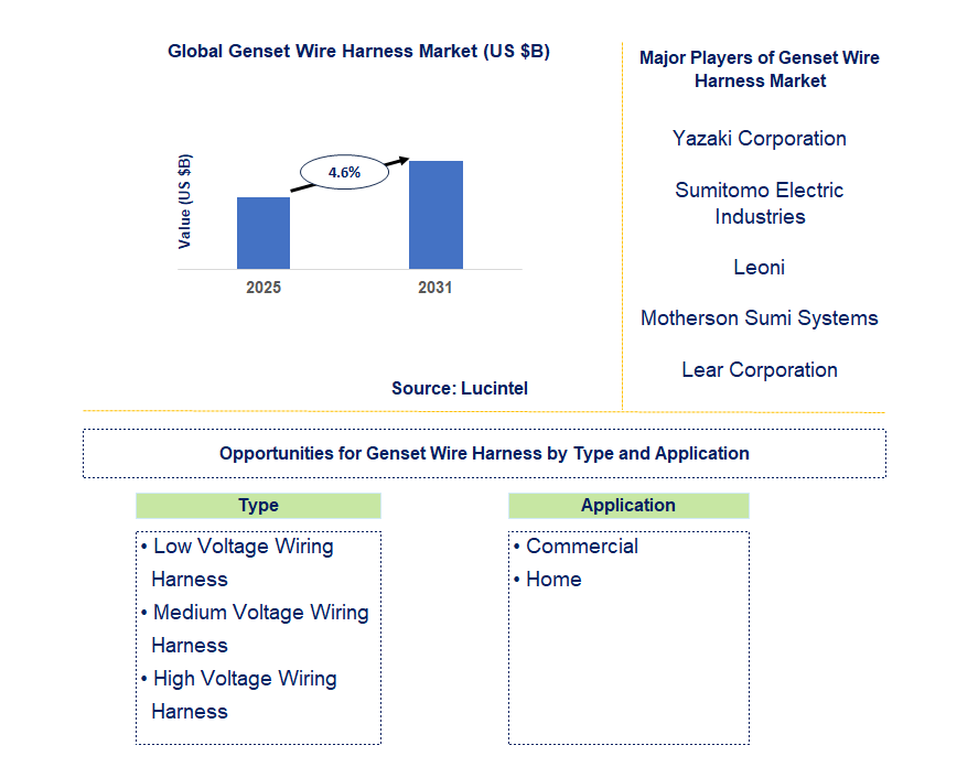 According to a market report by Lucintel, the future of the global genset wire harness market looks promising with opportunities in the commercial and home markets. The global genset wire harness market is expected to grow with a CAGR of 4.6% from 2025 to 2031. The major drivers for this market are the rising demand for backup power solutions, the growing adoption of advanced technology in generators, and the increasing industrialization & construction activities