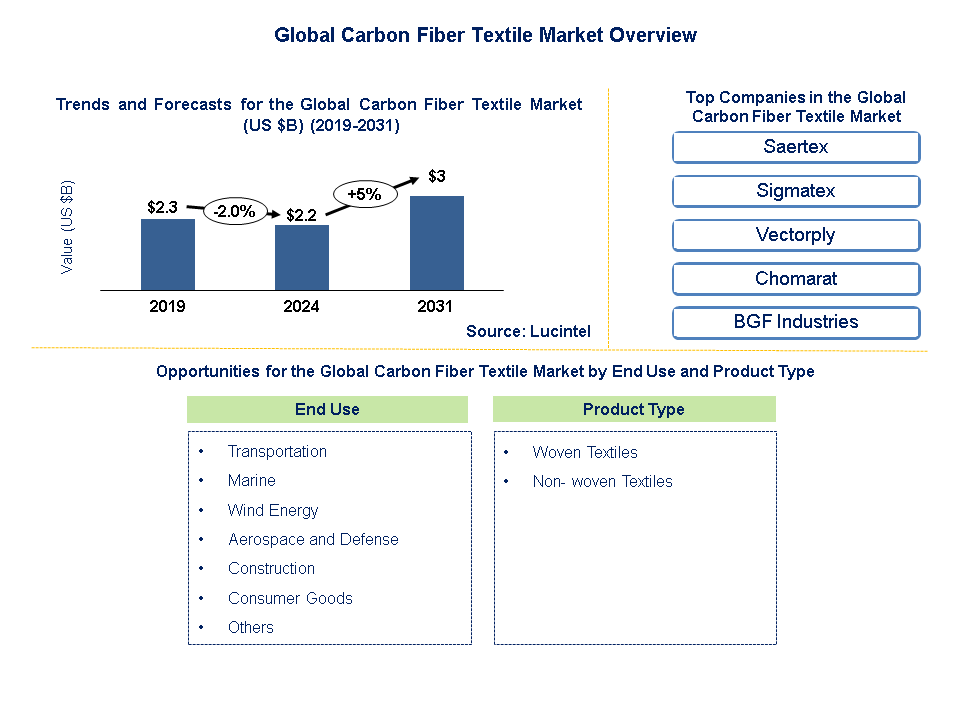 According to a market report by Lucintel, the future of the global carbon fiber textile market looks promising with opportunities in the transportation, marine, wind energy, aerospace and defense, construction, consumer goods end uses. The global carbon fiber textile market is expected to reach an estimated $3 billion by 2031 with a CAGR of 5% from 2024 to 2031. The major drivers for this market are the growing demand for lightweight and high performance composite materials in transportation, marine, wind energy, aerospace/defense, and construction industries.