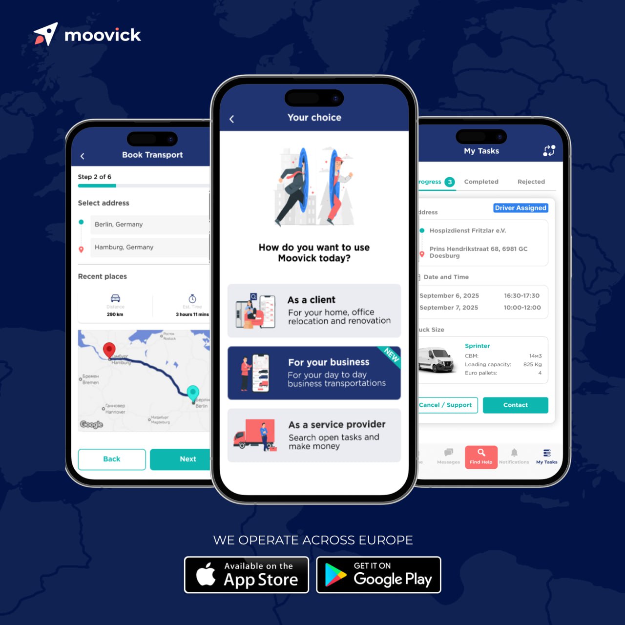 Moovick is a European platform specializing in relocation and logistics services — from domestic and international moving to office relocations, employee mobility, exhibition transport, and furniture logistics. Originally launched in Germany, we focus on serving the German and Dutch markets, with recent expansion into Belgium and Denmark as we continue to grow across Europe.