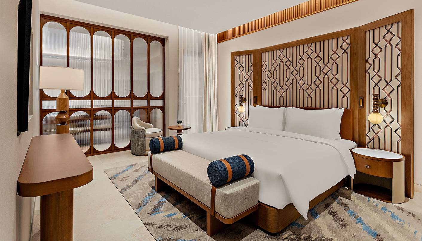 Just 40 minutes away from Zayed International Airport, the hotel features 156 beautifully designed rooms, suites and apartments, including accessible and connecting rooms to suit all travel needs. Interiors draw inspiration from Emirati culture and the natural beauty of the UAE, with soft desert tones, textured finishes, and locally influenced artwork creating a warm and welcoming atmosphere that feels distinctly rooted in place.