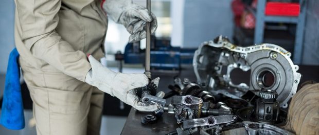 Mechanic checking a car parts in repair shop