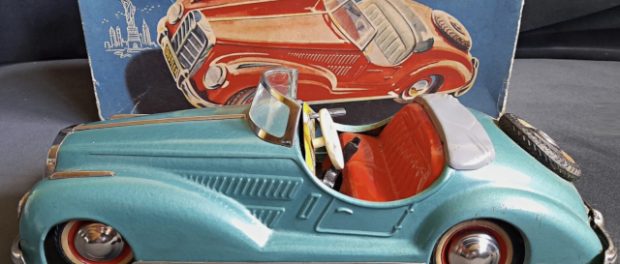 Other toys will include an early-to-mid-1950s German Distler Mercedes convertible US Zone vehicle with the original box and key, in excellent original condition (estimate: $350-$480); and 10 vintage Japanese toy buses, each one estimated to sell for $200-$500; plus a vintage tin Japanese circus truck #63, approximately 8 inches long and 3 inches tall (estimate: $200-$500).