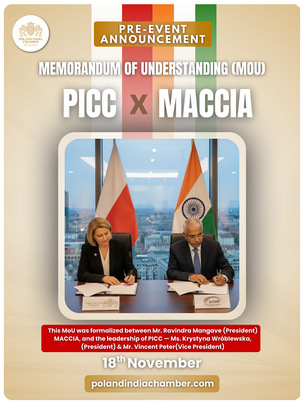 Mumbai, India, 2025-11-17 — /EPR Network/ — The Maharashtra Chamber of Commerce, Industry & Agriculture (MACCIA) has announced a landmark partnership with the Poland–India Chamber of Cooperation (PICC), Wrocław, by signing a Memorandum of Understanding aimed at fostering trade, technology exchange, and investment between India and Poland.