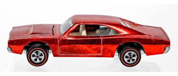 Individual Redline Hot Wheels cars, all in NM-MT or MINT condition, include a 1968 Custom Dodge Charger (estimate: $200-$300); a 1967 Custom Barracuda, Hong Kong (estimate: $175-$250); a 1967 custom Volkswagen, Antifreeze (estimate: $100-$200); and a 1969 rose red Mod Quad and a 1967 orange custom Cougar, Hong Kong, being sold as one lot (estimate: $150-$250). Also up for bid is a group of 24 vintage Hot Wheels tin buttons (estimate: $100-$200).