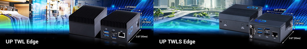 Notable due to their small form factors, the UP TWL Edge and UP TWLS Edge measure in at 92mm x 64mm x 45.2mm and 92mm x 77mm x 38.5mm, respectively. The UP TWL Edge offers a relatively simple I/O in keeping with its intended use as a low power, cost-efficient factory automation solution. Meanwhile, the UP TWLS Edge differentiates itself due to its slimline design and versatile DIN Rail and VESA mounting options. Of the two, the UP TWLS Edge offers a more industrially robust I/O, including an 8-bit GPIO, three USB, LAN, and a COM port for RS-232/422/485.