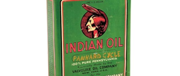 A circa-1920s one-gallon can from the Valvoline Oil Company, made specifically for Indian Motorcycles and maker-marked “Enterprise Stamping, Pittsburgh, Pa.,” is estimated at $5,000-$10,000. Overall, the can is bright and glossy on each side, showing a clean Native American graphic on both sides. Each side also has “Panhard Cycle’ handwritten into the grade panel. Both the original lid and carrying handle are intact. The grade of this iconic Indian can is 8.0.